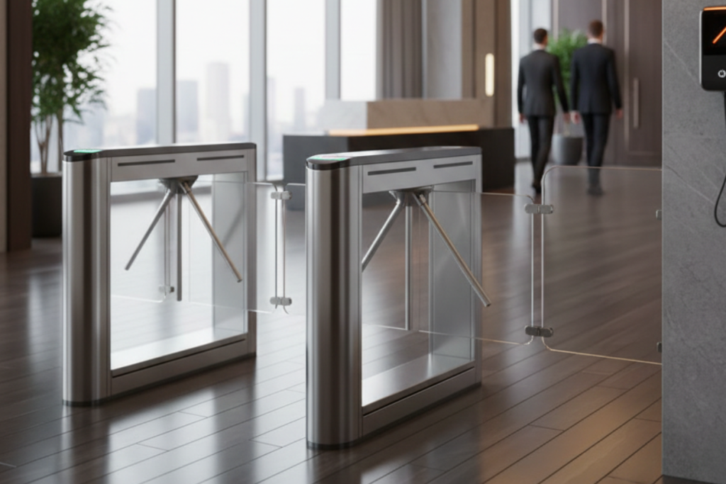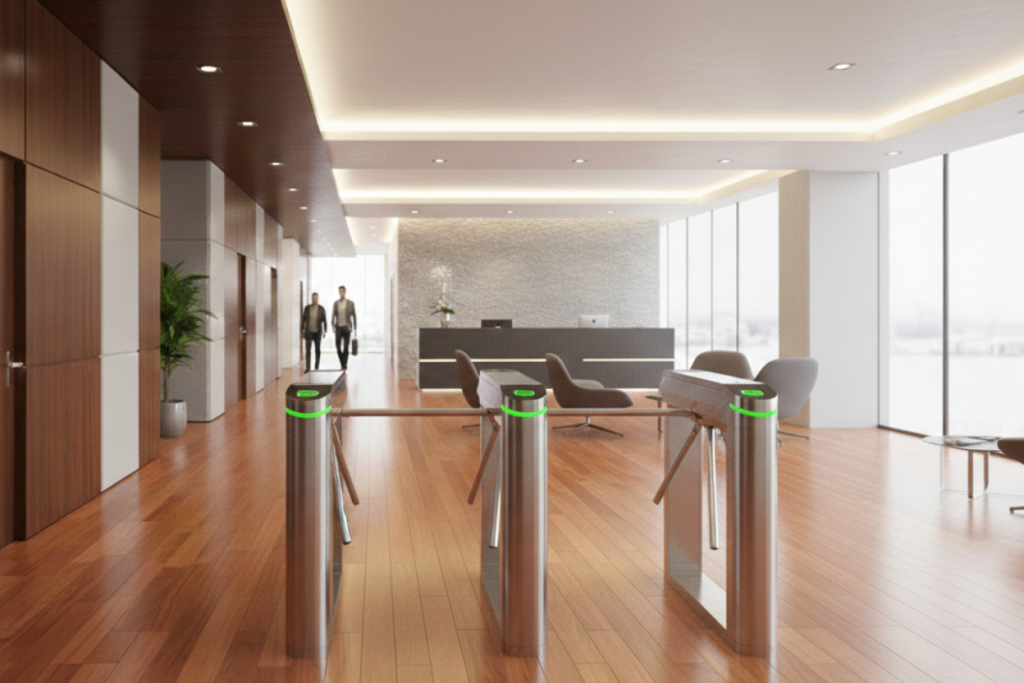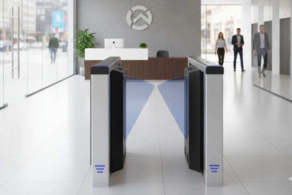 An access control system with automatic flaps that open for authorized users, ensuring controlled entry and smooth pedestrian movement.