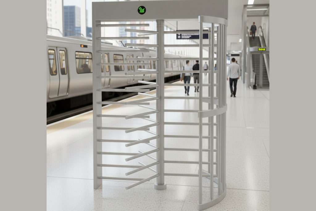 A secure access control barrier that allows entry only through authorized access cards, ensuring controlled and safe pedestrian movement